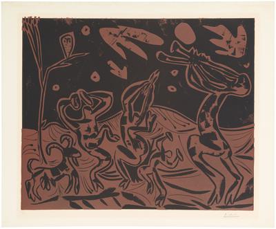 PABLO PICASSO1881 - 1973 DANSE NOCTURNE AVEC IN HIBOU (B. 936; BA. 1256) Linoleum cut printed in black and brown, 1959, signed in pencil, numbered 28/50, on Arches wove paper, unframedimage: 532 by 643mm 21 by 25⅜insheet: 622 by 751mm 24 1/2 by 29 1/2 inTo view Shipping Calculator, please clickhere