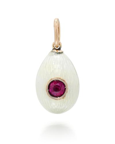 A JEWELLED GOLD ANDENAMEL EGG PENDANT, MOSCOW, 1908-1917enamelled in translucent oyster-white, centred with a cabochon ruby, struck on the loop with 56 standardheight 2cm, ¾in.To view Shipping Calculator, please clickhere