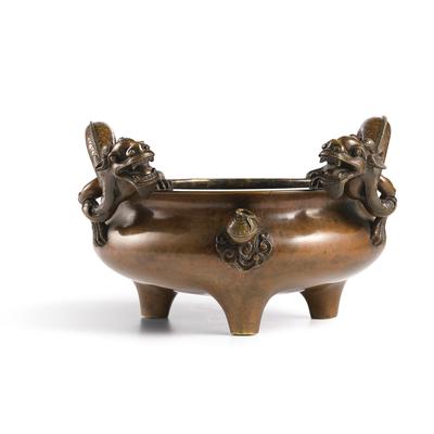 Property of a European Collector歐洲私人收藏A BRONZE 'DRAGON' TRIPOD CENSERQING DYNASTY, 18TH CENTURY清十八世紀 銅雙龍耳三足爐the compressedbody rising from three short tapered legs to an everted rim, with a pair of sinuous dragons clambering on the rim, flanking a flaming pearl floating aboveruyi-shaped cloud swirls,the basecentred with an apocryphal six-character Xuande mark within a recessed panelWidth 18.2 cm, 7⅛ in.To view shipping calculator, please clickhere