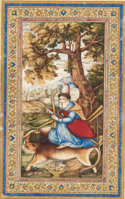 A MUSICIAN WITH A HARP AND BAGPIPE BENEATH A TREE, PERSIA, QAJAR, MID-19TH CENTURYgouacheheightened with gold on paper, with an attribution to Muhammad Zaman written near the tree and Zindeh b. Ahmad written on the borderpainting: 14.5 by 8cm.leaf: 29.5 by 20cm.