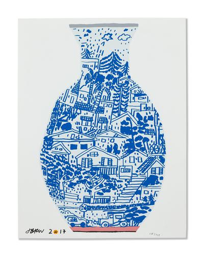 JONAS WOODb. 1977BLUE FRIMKESS LANDSCAPE POTscreenprinton paper, with a certificate of authenticity issued by Wood Kusaka Studio, Los Angelessigned, dated2017and numbered105/225signed and dedicated on the reverse26.5 by 20 cm. 10⅜ by 7⅞ in.----------------------------------------------喬納斯・伍德生於1977年藍色弗里克斯風景壺絲網印刷紙本,附設由藝術家工作室簽發之作品保證書款識JBRW,2017,105/225JOHN, PEACE AND LOVE, JBRW (作品背面) 版數105/225此作品共225幅26.5 x 20 公分,10⅜ x 7⅞ 英寸
