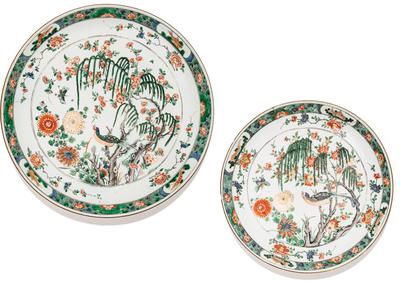 DEUX PLATS EN PORCELAINE DE LA FAMILLE VERTE DYNASTIE QING, ÉPOQUE KANGXI | 清康熙 五彩花鳥紋盤二件 | Two large Famille Verte dishes, Qing Dynasty, Kangxi period