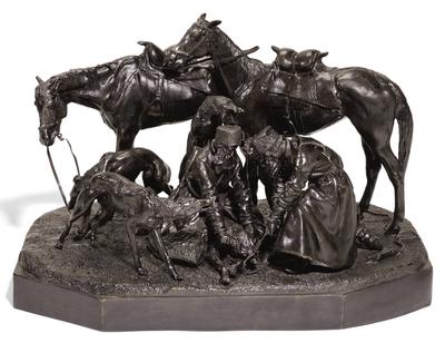 BINDING THE WOLF: A BRONZE FIGURAL GROUP, CAST BY WOERFFEL, ST PETERSBURG, AFTER THE MODEL BY NIKOLAI LIEBERICH (1828-1883), 1884the base signed 'SCULP. LIEBERICH.', 'FABR. C.F. WOERFFEL. / ST. PETERSBURG.' and with the 10 year Ministry of Finance patent stamplength 39.5cm, 15½in.