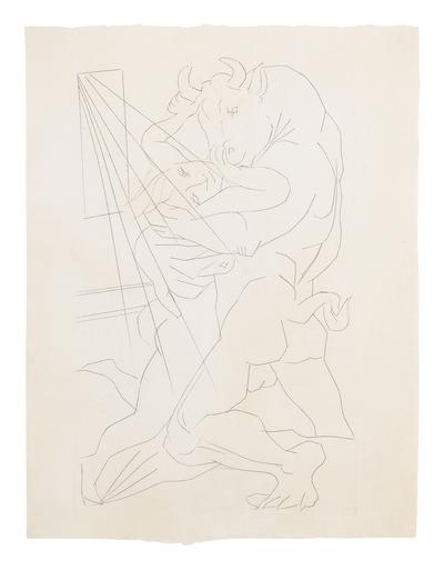 PROPERTY FROM THE COLLECTION OF MARINA PICASSO PABLO PICASSO (1881 - 1973) MINOTAURE EMBRASSANT UNE FEMME (B. 283; BA. 431) Engraving, 1934, printedin 1942, from the edition of 55, on Montval laid paper, printed by Lacourière, Paris, framed plate: 242 by 398 mm 9½ by 15⅝ in framed: 502 by 610 mm 19¾ by 24 in
