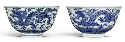TWO BLUE AND WHITE 'DRAGON' BOWLS DAOGUANG SEAL MARKS AND PERIOD清道光 青花雲龍趕珠紋盌一組兩件 《大清道光年製》款each withdeep rounded sides and gently flared rim,painted around the exterior with two five-clawed dragons striding above turbulent wavesin pursuit of the flaming pearls, the base with a six-character seal mark in underglaze blue (2) Diameter 10.9 and 10.8 cm, 4⅓ and 4⅓ in.
