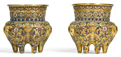 A PAIR OF CHAMPLEVE ENAMEL CENSERSQING DYNASTY, 18TH CENTURY清十八世紀 鏨胎琺瑯纏枝蓮紋六足爐一對each decorated to the body with interspersing ram and lion masks against lotus born on leafy stems, the neck similarly decorated with lotus betweenruyi pendants and a row of semi-precious stones, all supported on six tapering legs (2) Height 12.1 and 12 cm, 4¾ and 4¾ in.
