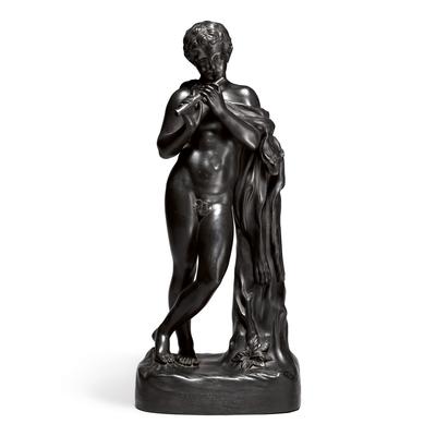 AWEDGWOODBLACK BASALT FIGURE OF A FAUN 19TH CENTURYmodeled leaning against a tree stump playing a flute witha lion pelt over his shoulder, the rectagular mound base impressed FAUN.FLUTE, the reverse impressed uppercase WEDGWOOD.Height 17⅝ in.44.7 cm