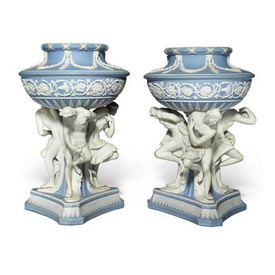 A PAIR OF WEDGWOOD BLUE AND WHITE JASPER-DIP 'MICHELANGELO' VASES CIRCA1840shape no. 180, each applied around the exterior of the body with bands of foliate scrolls and stiff leaves, the neck applied with foliate festoons suspended from goat's head masks, raised on a fluted base supported by three white-jasper classical male figures, upon triangular bases, eachimpressed uppercase WEDGWOOD, incised //.Height 11⅜ in.28.9 cm