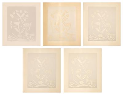 PABLO PICASSO 1881 - 1973 FIVE WORKS: PORTRAIT D'HOMME (B. 1230; BA. 1848; PP. L-188) Five linoleum cuts printed in pearl grey, 1966, proof impressions printed by Arnéra, Vallauris, before the published edition of 150 rinsed with India ink, on Arches wove paper, with the Marina Picasso inkstamp verso (L. 3698) each image: approx. 340 by 279mm 13⅜ by 11ineach sheet: approx. 437 by 380mm 17¼ by 15in (5) To view shipping calculator, please clickherePlease note, Condition 11 of the Conditions of Business for Buyers (Online Only) is not applicable to this lot.