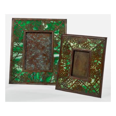 Property from the Geyer CollectionTIFFANY STUDIOSTWO "GRAPE VINE" PHOTOGRAPH FRAMEScirca 1915favrile glass, patinated bronzeeach impressedTIFFANY STUDIOS/NEW YORKlarger: 9⅜ x 7⅞ in. (23.8 x 20 cm) smaller: 7½ x 6½ in. (19.1 x 16.5 cm)