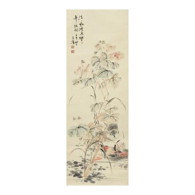 WANG XUETAO 1903-1982MANDARIN DUCKS, ink and color on paper, hanging scroll王雪濤 1903-1982鴛鴦花卉 設色紙本 立軸signed Xuetao, dated renwu (1942), autumn, with two seals of the artist,chi yuan,wang xue tao yin款識:泛泛風波鳥,雙雙弄紋羽。壬午(1942)秋夕,雪濤。鈐印:遲園、王雪濤印Height 37⅝ in., 95.6 cm; Width 13¼ in., 33.6 cm
