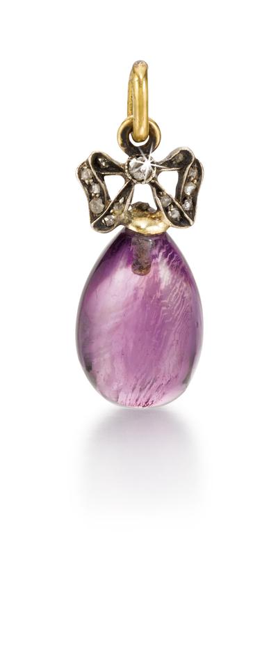 A jewelledgold and hardstone egg pendant, late 19th / early 20th centurycarved from amethystand surmounted by a bow set with rose-cut diamonds, with illegible workmaster's initials, 56 standardheight without loop 2.4cm, ⅞in.