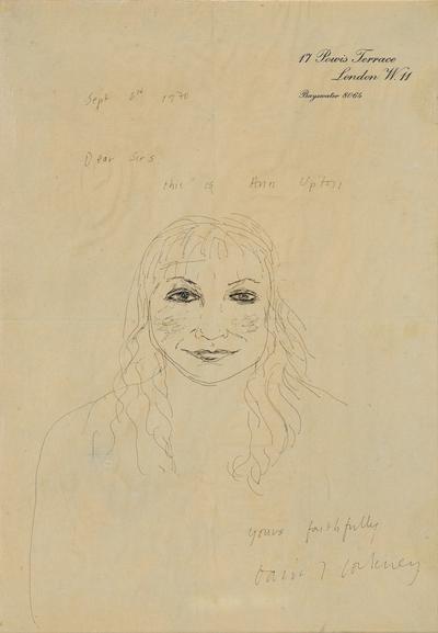 Working with Hockney: Property from the Estate of David GravesDAVID HOCKNEY, R.A.b.1937THIS IS ANN UPTONsigned,titled, datedSept 6th 1970 and inscribedpen and ink on letter headed paperunframed: 29 by 20.5cm.; 11½ by 8in.framed: 31 by 22cm.; 12¼ by 8½in.Please note: Condition 11 of the Conditions of Business for Buyers (Online Only) is not applicable to this lot.